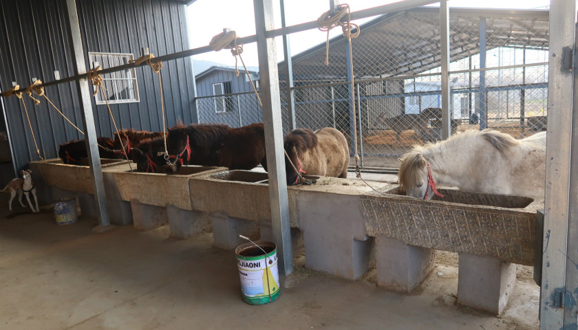学校南侧是尚待修缮的操场与马场。学校的一名工作人员正在喂马,“一共8匹马和3只梅花鹿,还有一些孔雀和鸟类。都是学校的,有的是别人送的,有的是学校买的。”工作人员称,“学校搬迁至新校区后开设了马术课,这些动物都是为孩子上课准备的。”