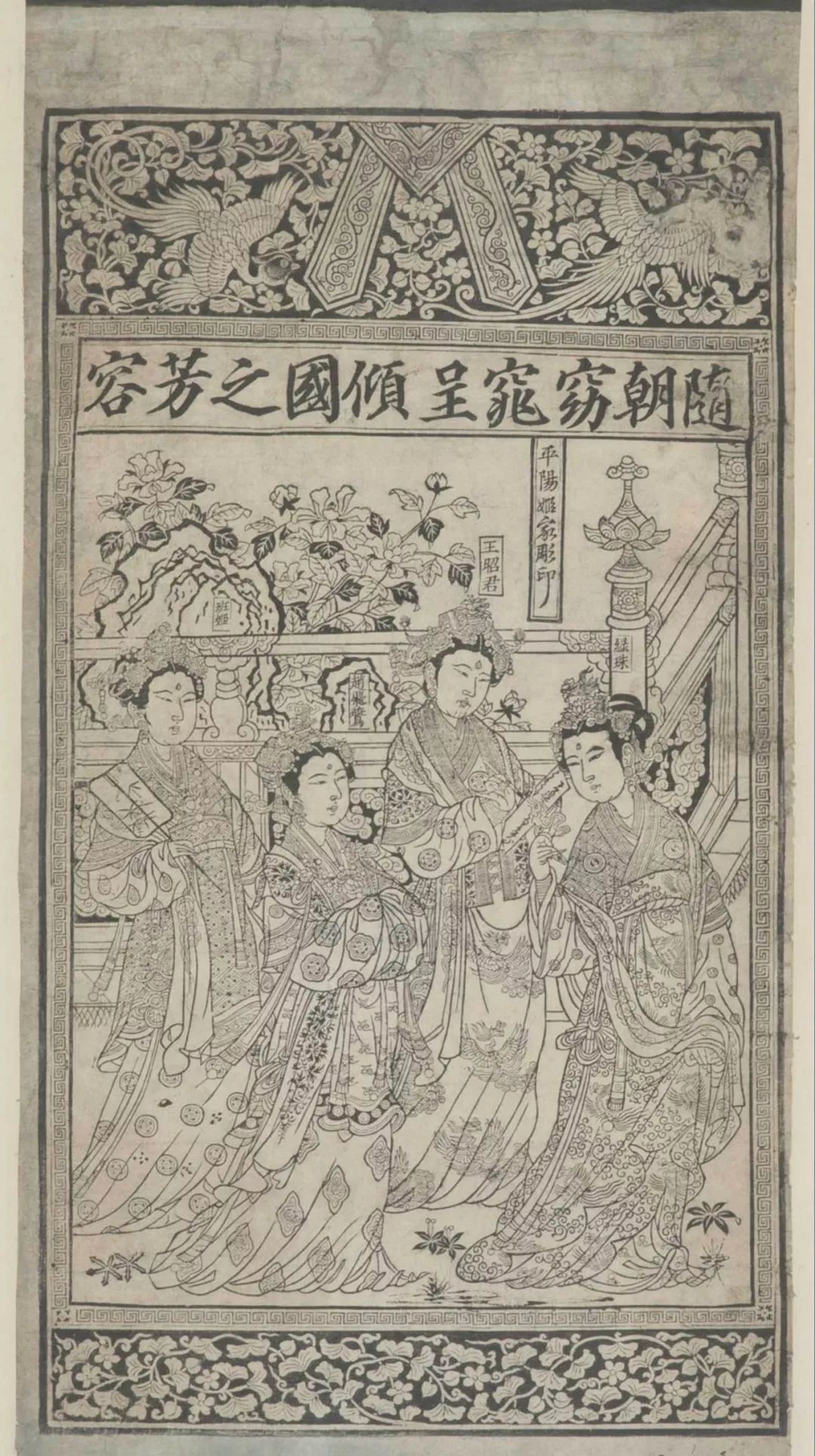 一九〇九年,俄国探险家科兹洛夫(P. K. Kozlov)在内蒙古西境黑城遗址发现一幅金代平阳版画,纵七十九厘米、横三十二点五厘米,题为“隋朝窈窕呈倾国之芳容”,俗称“四美图”。在美人上方空白处,有一竖行小字题款“平阳姬家雕印”,说明此画从山西临汾金殿村流入西夏黑水城。题款下刻印湖石、楼阁和古代四大美人,包括绿珠(西晋富商石崇的艺妓)、王昭君、赵飞燕、班姬(婕妤),皆体态丰盈,生动反映了北方人的审美情趣。