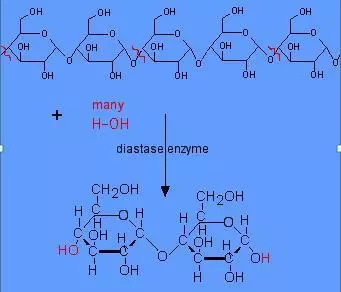 这样一来,麦芽中就含有了丰富的淀粉水解酶,包括α-淀粉酶、β-淀粉酶和极限糊精酶。而这些淀粉酶就是淀粉的糖化剂。在淀粉转化酶的作用下,淀粉发生水解反应,生成的就是麦芽糖等。这就是饴糖的生产原理。