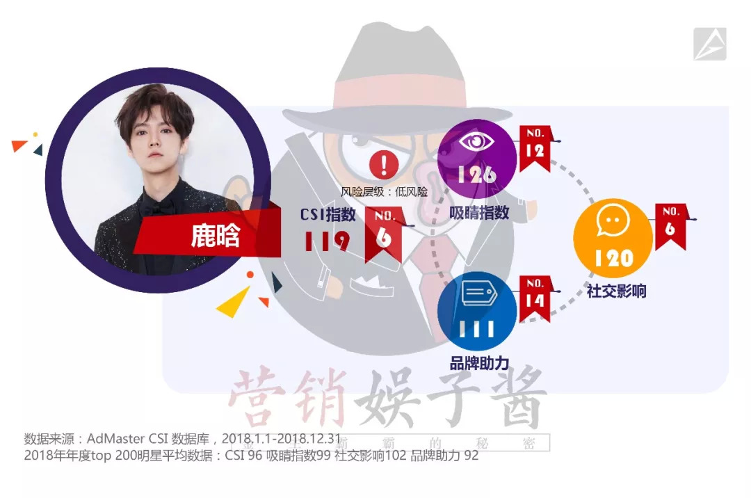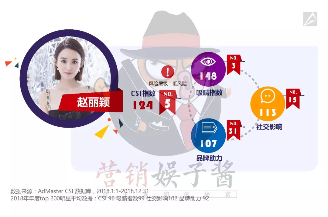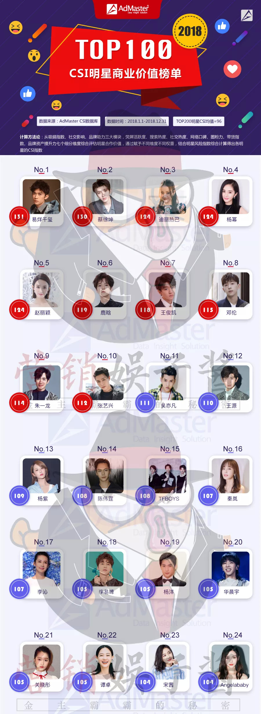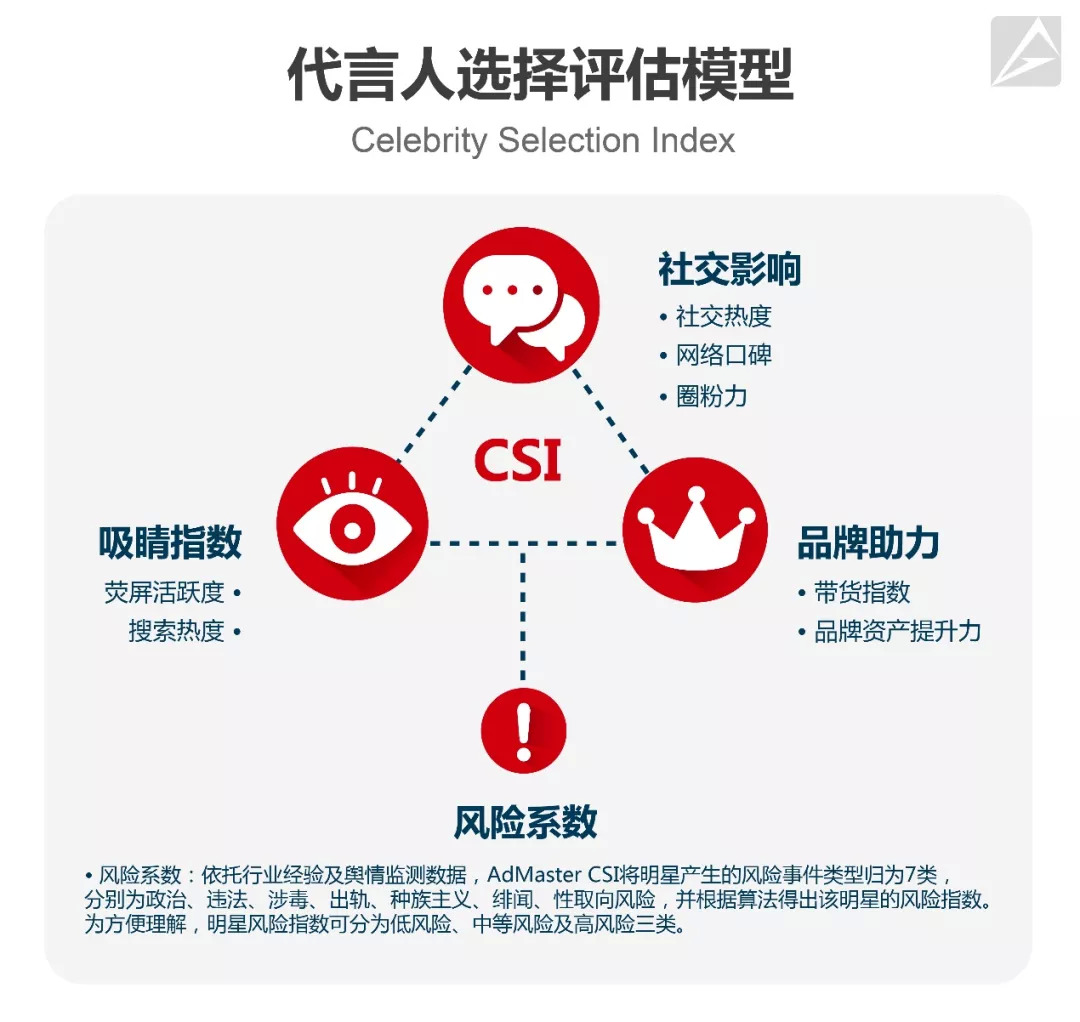 娱乐资本论携手第三方社会化洞察与分析数据技术公司AdMaster联合推出2018 CSI最具商业价值明星榜单TOP100。这份榜单从吸睛指数、品牌助力与社交影响力搭建了代言人选择评估模型,并引入了风险系数。AdMaster将明星产生的风险事件类型归为7类,分别为政治、违法、涉毒、出轨、种族主义、绯闻、性取向风险,并根据算法得出该明星的风险指数。这样的风险评估体系在今年的政策环境下更显得尤为重要。