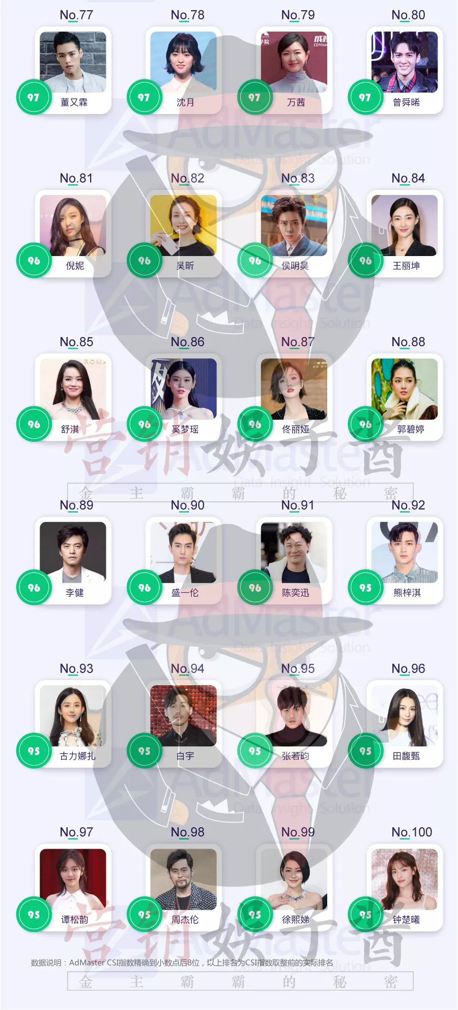 相比厮杀激烈的男星阵容,女星相对更迭缓慢。去年位列top10的四位女星中保留了三位,除了因深陷税务风波而直接从第十掉出前100的范冰冰,杨幂、迪丽热巴、赵丽颖三位女星依旧位居前五,保持着稳定的头部商业价值。