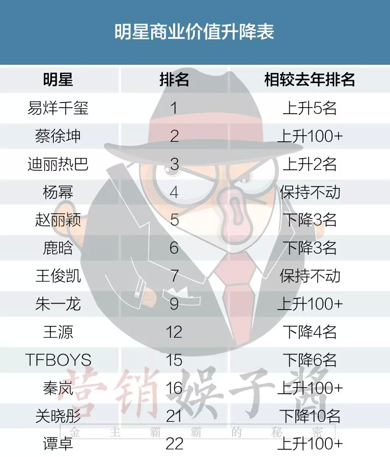 而三小只在进行了超过一年的独立发展阶段后,各自的商业价值也开始凸显。王俊凯继续稳定在第七位,王源则在今年受签约范冰冰工作室影响,商业价值有所下降。易烊千玺登上了榜单首位,作为00后男星,成为了最具商业价值的新生代力量。