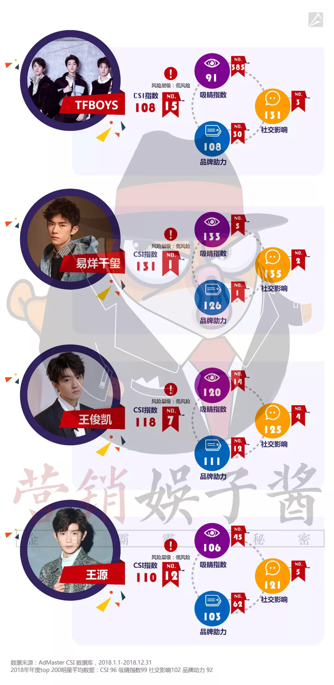 “许多品牌愿意和易烊千玺展开合作是因为他更成功的实现了从童星向青年偶像的转型。此前TFBOYS给大众带来的少年团体观感太浓厚,儿童色彩充足,虽然有着高国民度但是为品牌带来的概念赋能不够,今年,易烊千玺通过《这就是街舞》成功丰满了形象,区别于阳光开朗少年的酷盖会更具备成熟感,也因此更受品牌欢迎。”AdMaster总裁王玉梅(Maggie Wang)说。