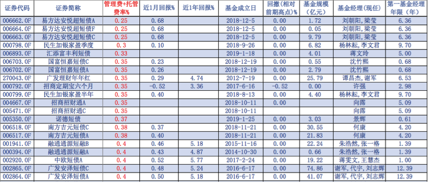 界面新闻梳理发现,目前市场上费率最便宜的是去年12月刚刚成立的易方达安悦超短债,管理费与托管费合计仅为0.25%。而同类产品中费率最高的基金嘉实超短债,也是成立时间最长的短债基金,费率为0.55%,二者相差了0.3%。从近一月业绩来看,二者也刚好保持0.3%左右的业绩差距。下表为综合费率较低的20只短债基金名单: