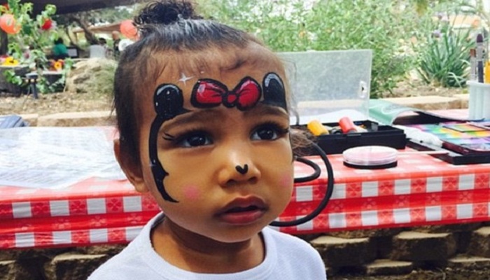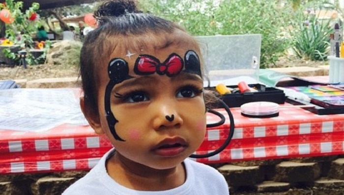 在上传到Istagram的照片里,美国歌手坎耶·维斯特的妻子——也就是金·卡戴珊自己,站在女儿身后,而此时一位艺术家正在细致地在小诺丝脸上涂画。