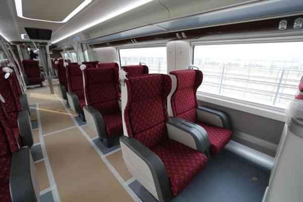 车辆选用最大3300毫米断面,更加宽敞明亮。车厢也分为三类:考虑人机工程学,普通车设置双排座椅;商务车设置2+1座椅,确保舒适性;设置行李车,负责行李托运。