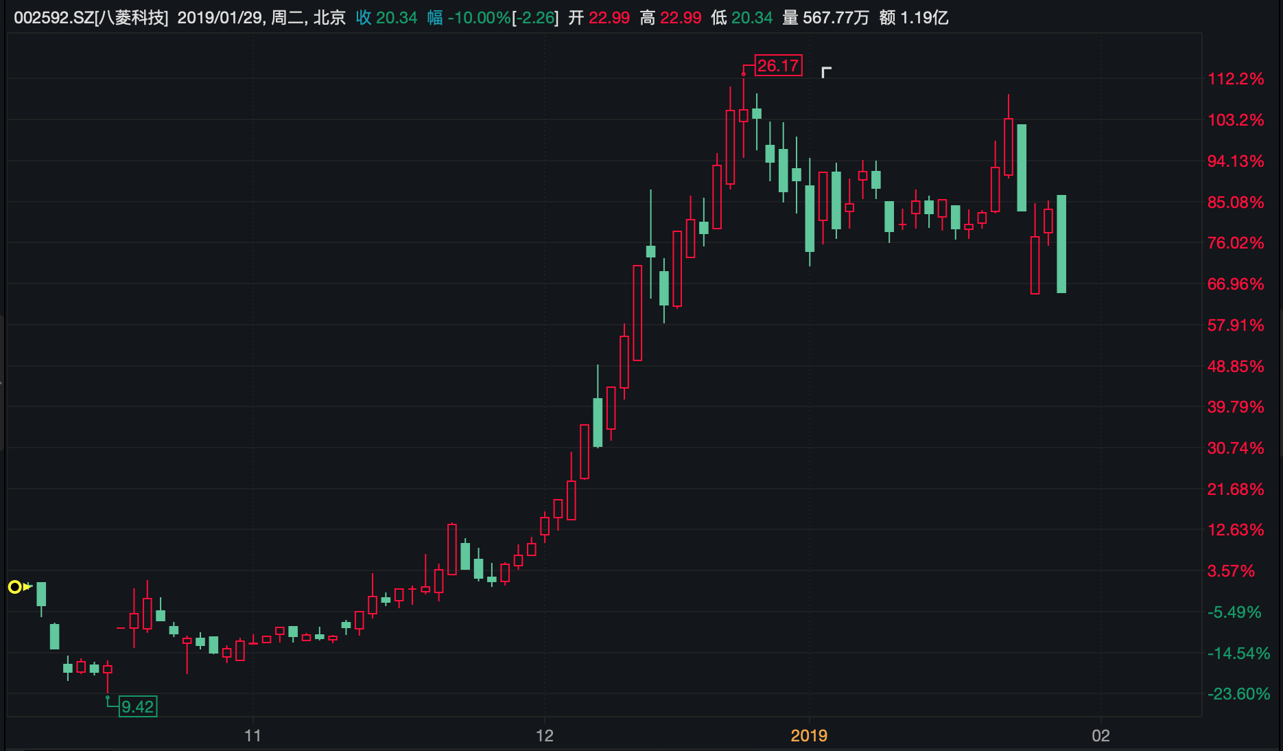 继又一桩收购案失败后,八菱科技1月28日因违规披露收到深交所监管函。1月29日,八菱科技股价在几经波折后跌停,收盘价20.34元/股。再妖的股也撑不住了,这是八菱科技5天内第二次跌停。尽管这样,其股价仍距离10月初最低谷时9.4元/股溢价了60%,市盈率高达127倍,而行业平均值仅有13倍左右。