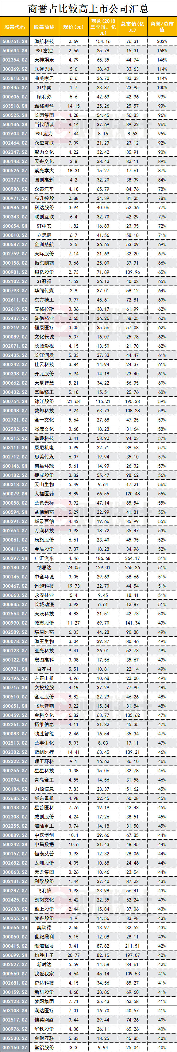 近来A股公司频频踩雷商誉计提减值引发业绩变脸,一些公司甚至因此巨亏。而据财联社统计,截至2018年第三季度,商誉占比总市值超过40%的上市公司有近150家之多。