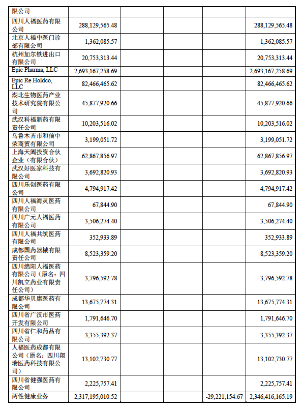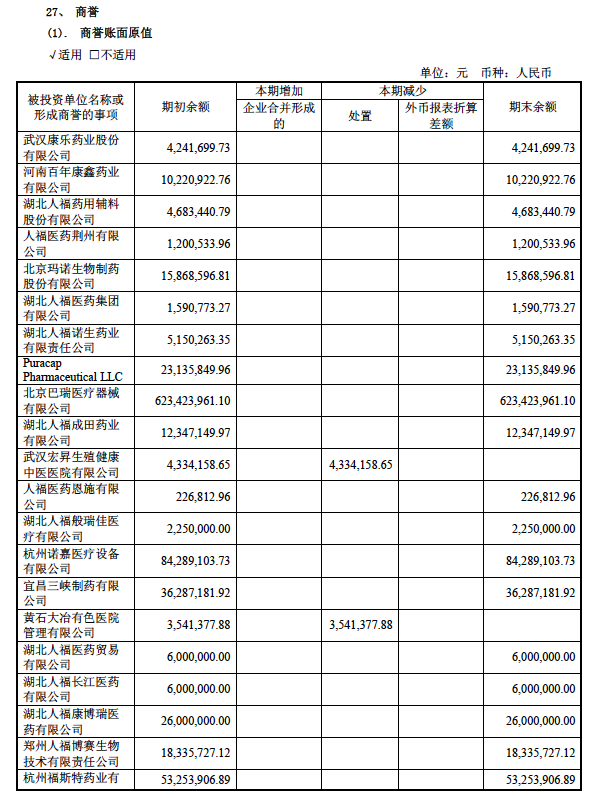 其中,商誉值较大的为Epic Pharma, LLC。2016年,人福医药以5.5亿美元收购Epic Pharma及附属企业100%股权,合并产生商誉约26.93亿元。
