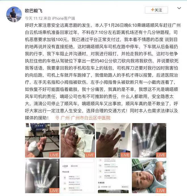 今天(29日)上午,一位网友在微博称自己在广州乘坐嘀嗒顺风车时,因拒绝司机额外加钱要求,与司机发生冲突,被其用刀割伤手指。司机开车跑掉,乘客随后报警就医。