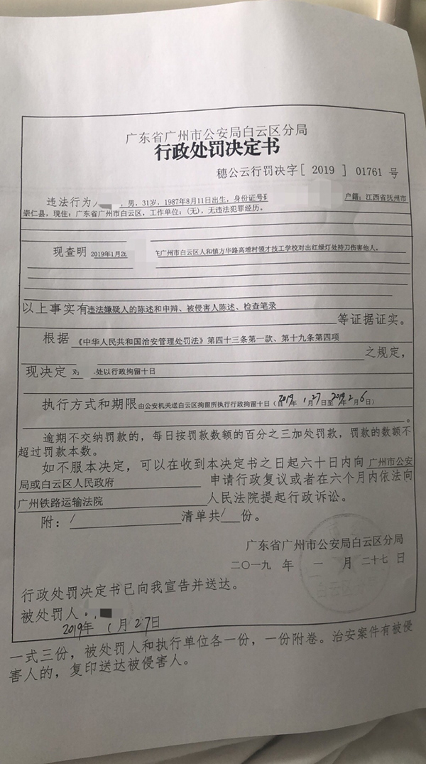 据《新快报》报道,警方在乘客报警后找到了该司机,依据《治安管理处罚法》规定对其处以行政拘留十日。处罚决定书显示,该司机31岁,江西人,现住广州,无违法犯罪经历,2019年1月26日在广州市白云区人和镇方华路高增村领才技工学校对面红绿灯处持刀伤害他人。