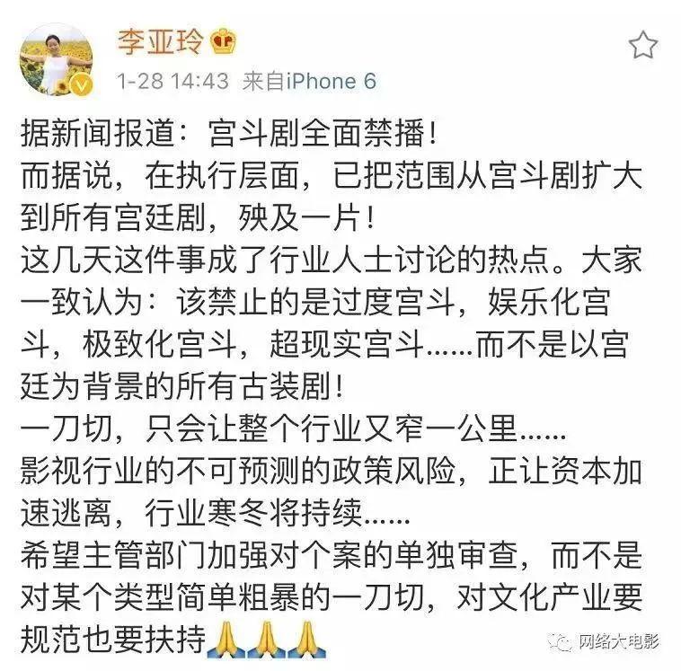 编剧李亚玲在事件发酵的第三天亲自下水,微博更文,“据说,在执行层面,已把范围从宫斗剧扩大到所有宫廷剧,殃及一片”,言下之意,即所有带有宫廷背景的古装剧都将遭殃。在回复网友评论中,李亚玲更是直言,“(目前)播出平台已经对所有宫廷剧重审!涉及宫廷的古装剧都暂停上线和开机了”,进一步加实了古装剧的“受难”传言。