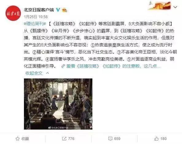 近日,北京日报官方媒体发长文,点名批评《甄嬛 传》《芈月传》《延禧攻略》《如懿传》等在内的多部古装宫廷剧,“丰富大众文化娱乐生活的同时,也给社会带来了不少负面影响”。专文内明确指出,古装宫廷剧具有的五大危害: