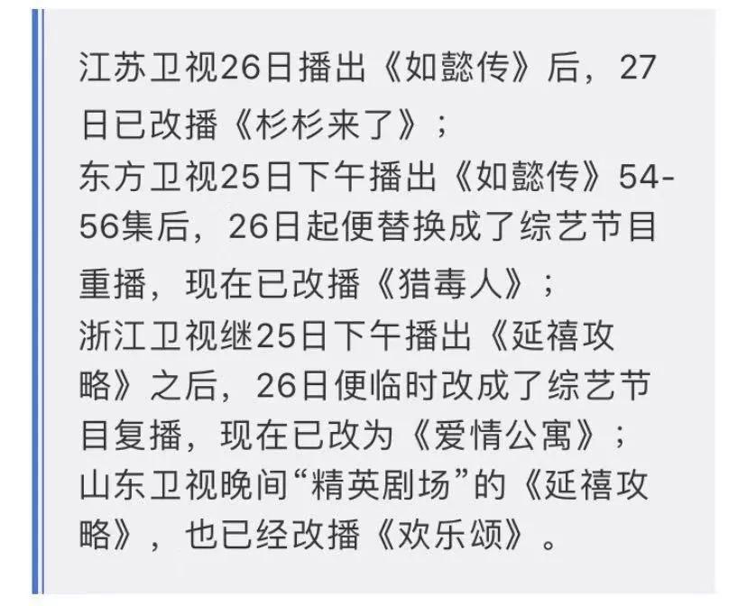 随后,网友继续爆料,称“(目前)已有五家电视台接到禁播宫斗剧的通知,并且已被紧急叫停”。有记者对其进行了相关调查,发现正在浙江、东方、山东等一二线卫视“多轮播出”的两部宫廷剧《延禧攻略》《如懿传》正面临着停播危险。其中,江苏卫视在播的《如懿传》于1月24日播到第12集时,暂停播出,由《杉杉来了》临时顶上;浙江卫视在播的《延禧攻略》也于26日临时被换。