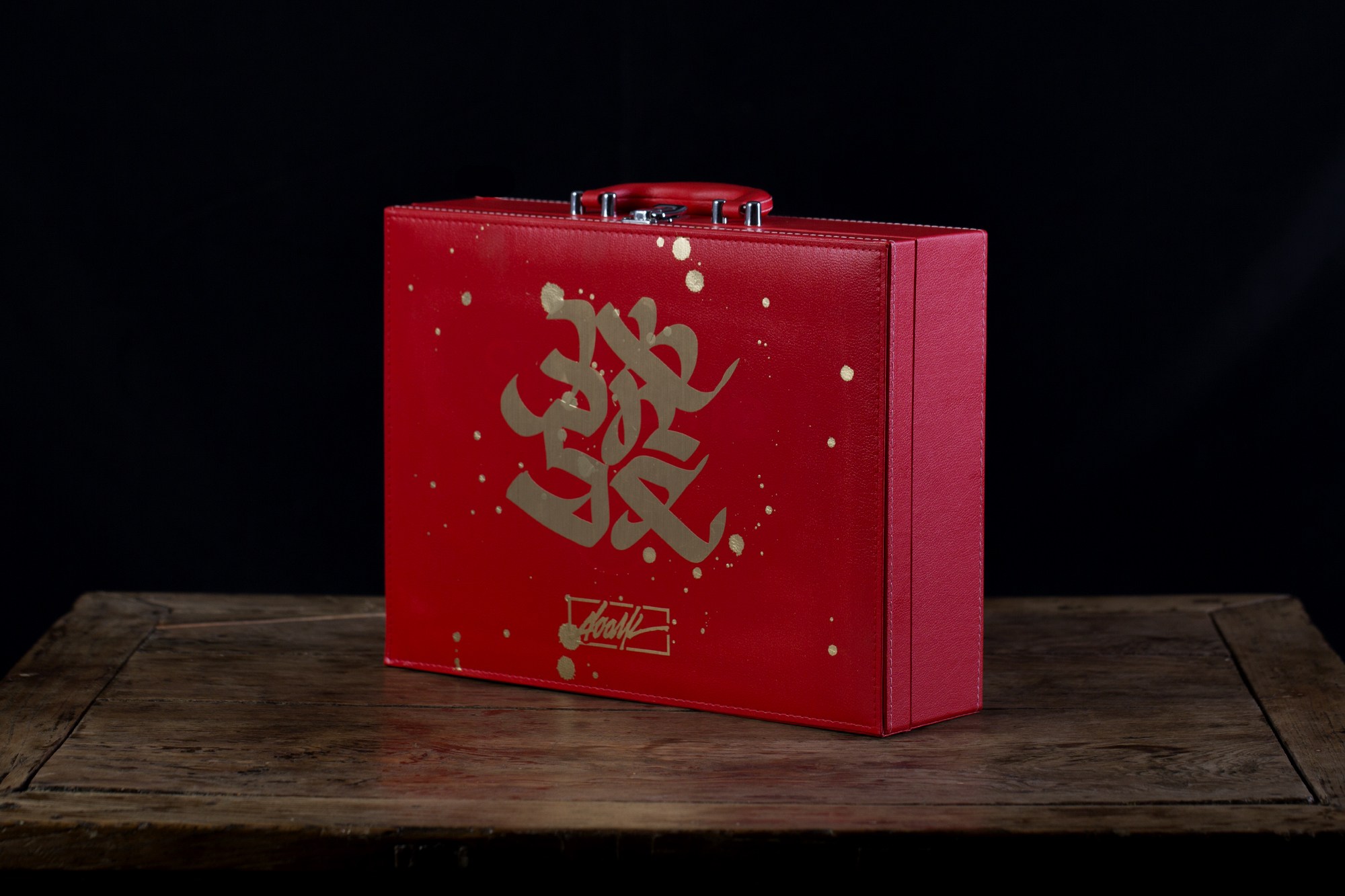 在涂鸦创意机构400ML推出的“恭喜发财”新年系列中,最引人注目的想必是那套极具中国特色的定制麻将套装。套装内含1副麻将牌、60枚筹码、2枚抛投筛子和1只专属麻将盒。每一枚麻将底部都被涂上鲜艳的“中国红”,涂鸦式手写字体则带来文化冲撞的新鲜感。麻将盒亦以喜庆红色调为基底,用喷涂形式金色喷点洋溢四周。相信过年和亲戚朋友搓麻时用上这副麻将,手气应该不会太差。