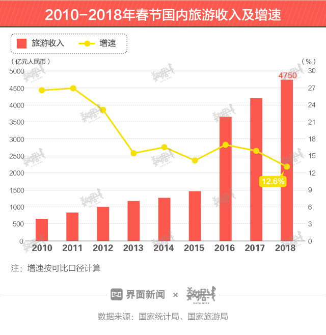 春节国内旅游市场平稳增长。根据国家统计局、国家旅游局数据,2018年春节国内旅游收入为4750亿元人民币,但增速降至12.6%,为2010年以来最低水平。