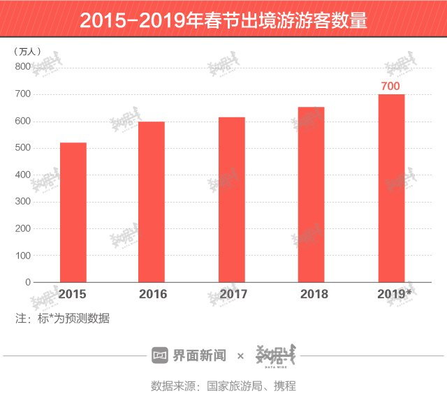 春节期间,出境游客流高峰也再次到来。根据携程数据,2019年春节黄金周出境游人次将近700万。2015年,中国春节出境游客数量才刚刚超过500万人。