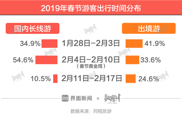 但就在假期还未正式开始前,已经有超过3成游客即将结束他们的春节出行。同程旅游数据显示,春节错峰出游明显,34.9%的国内长线游和41.9%的出境游都发生在春节黄金周前一周。