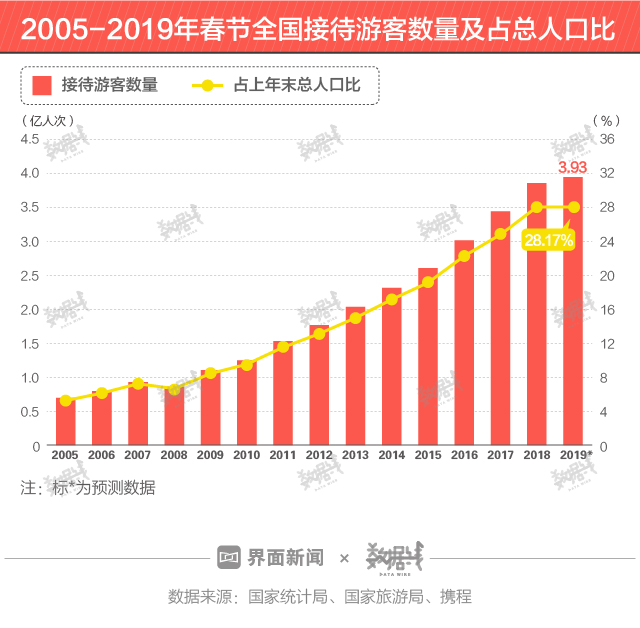 错峰出游还是因为春节旅游的人太多了。携程预计,2019年春节黄金周将有约4亿人次出行,其中出境游人次将近700万。相较于2005年,2019年全国接待游客数量增长3.24亿人次,占总人口比也从5.31%升至28.17%。