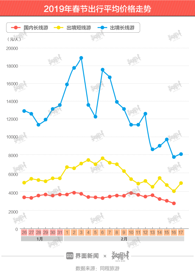 同程旅游数据显示,2019年春节国内长线游价格保持在2500-4000元/人区间,与出境短线游价格差距较小,但仍与出境长线游动辄10000元/人的价格有较大差距。