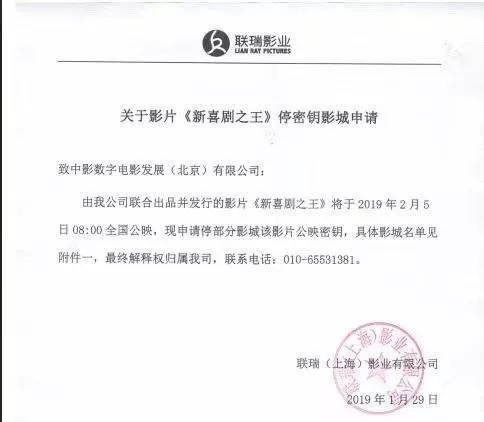 1月29日下午,由《新喜剧之王》发行方联瑞影业发给中影数字的申请函以及影城名单开始在各电影微信群流传,在申请中联瑞提出,希望能够暂停全国76家影城春节期间《新喜剧之王》的公映密钥(能让影院放映某部影片的密码),“剥夺”这些影城公映该片的权利。