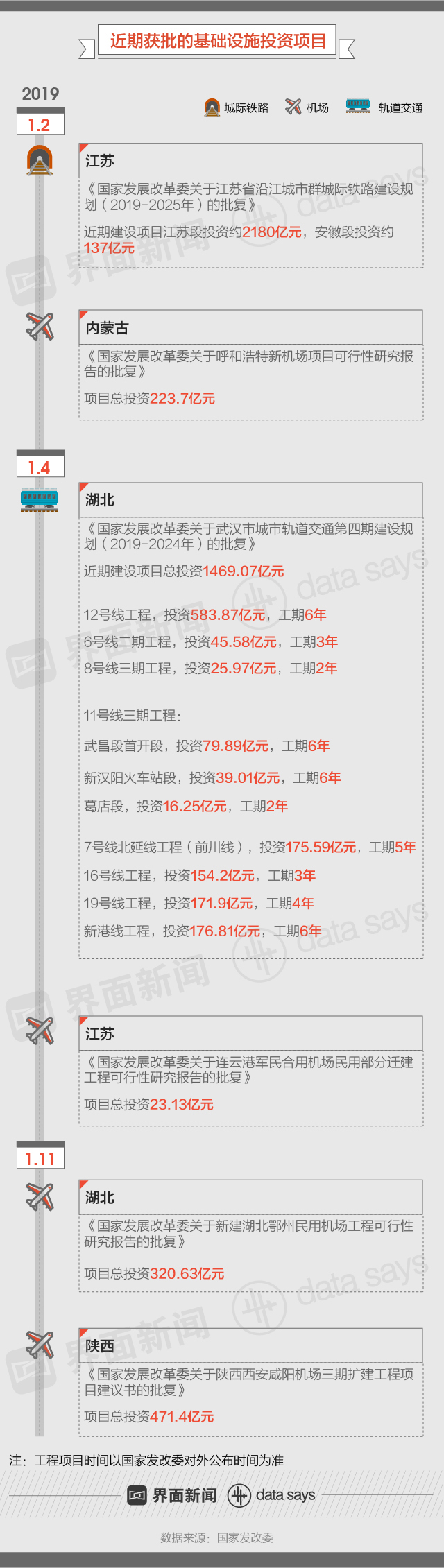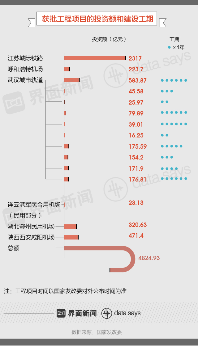 继2018年末多个基建工程项目获国家发改委批复后,新年伊始发改委再次发力。据界面数据(公众号ID:tuli_shuju)统计,截至2019年1月30日(开年不到1个月),国家发改委官网至少公布了6个基础建设工程项目的获批信息,涉投资额超4800亿元。