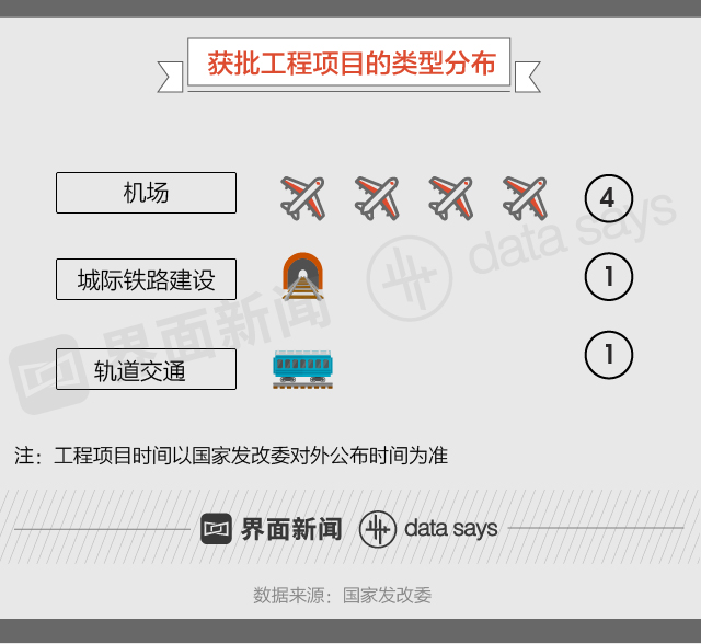 分类型来看,获批最多的是机场项目,共计4个。除此之外,还有1个城际铁路建设项目和1个轨道交通项目。