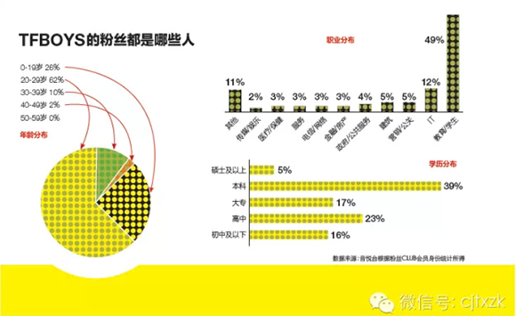 腾讯智酷调研显示,TFBOYS粉丝中00后和90后分别占据总粉丝数的45%和40%,而新浪发布的统计数据显示,29岁以下的TFBOYS粉丝数占比77%。“学生是TFBOYS最核心的粉丝来源,而中学生、大学生又是学生粉丝中的主体,这批人是互联网深度用户,又是中国萌文化、宅文化、腐文化最核心的人群。”曾在唱片公司担任宣传总监并对中国流行趋势有长期关注研究的Jackie认为,无论是用“萌”还是“腐”去定义TFBOYS,最起码他们满足了人们的娱乐需求。