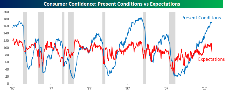 Bespoke Investment Group联合创始人希基(Paul Hickey)表示,如果现状指数和预期指数之差超过50,“衰退就不远了”,而目前,两者之差是82.3。他还表示,当前和未来指数出现这样大的差距是经济增长处于末期的最后一个指标。