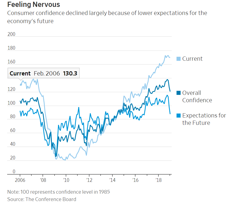 此前,美国消费者信心曾升至接近18年以来的高位水平。不过,在美国政府关门的五周时间里,以及在中美贸易关系持续紧张和美股震荡的负面影响下,美国消费者信心开始下降。