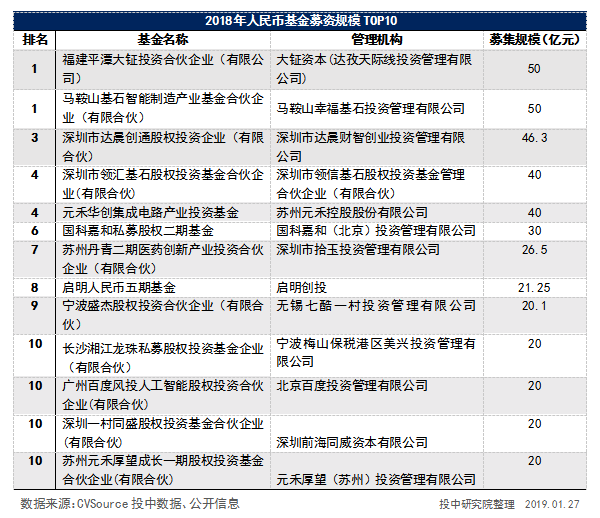 根据CVSource投中数据统计,2018年市场化的VC/PE机构完成募集的最大十支人民币基金如下: