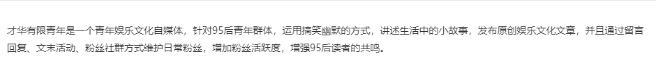 据公司简介称,“才华有限青年”自媒体号的主要针对95后年轻群体,用搞笑幽默的方式讲述生活中的小故事,发布原创娱乐文化文章。