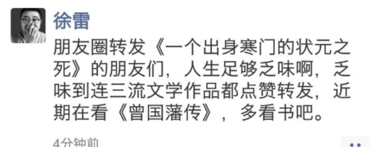 对于《一个出身寒门的状元之死》一文,京东商城CEO今日发朋友圈直怼其为“三流文学作品”:朋友圈转发《一个出身寒门的状元之死》的朋友们,人生足够乏味啊,乏味到连三流文学作品都点赞转发,近期在看《曾国藩传》,多看书吧。
