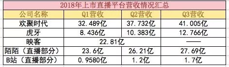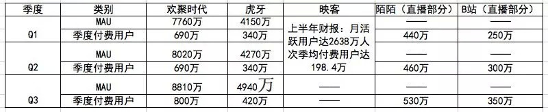 从MAU(月移动活跃用户)来看,欢聚时代在Q3季度已经突破8810万;而虎牙也在Q3接近5000万;另外,映客的月活跃用户达到2638万——至于陌陌和B站,考虑到陌陌的庞大的用户基础,其直播用户的群体或仅在欢聚时代之后。
