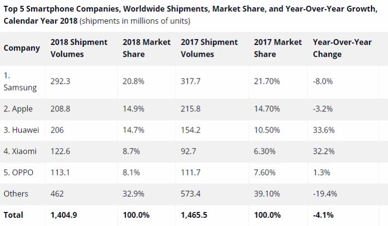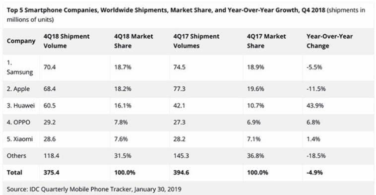 随着市场饱和,竞争加剧,全球智能手机市场显得越来越艰难。据外媒最新消息,美国市场研究公司IDC日前发布了去年四季度和2018年全球智能手机市场报告,报告显示,三星电子第四季度是全球最大的智能手机供应商,华为在2018年的手机出货量差280万部就能超越苹果。