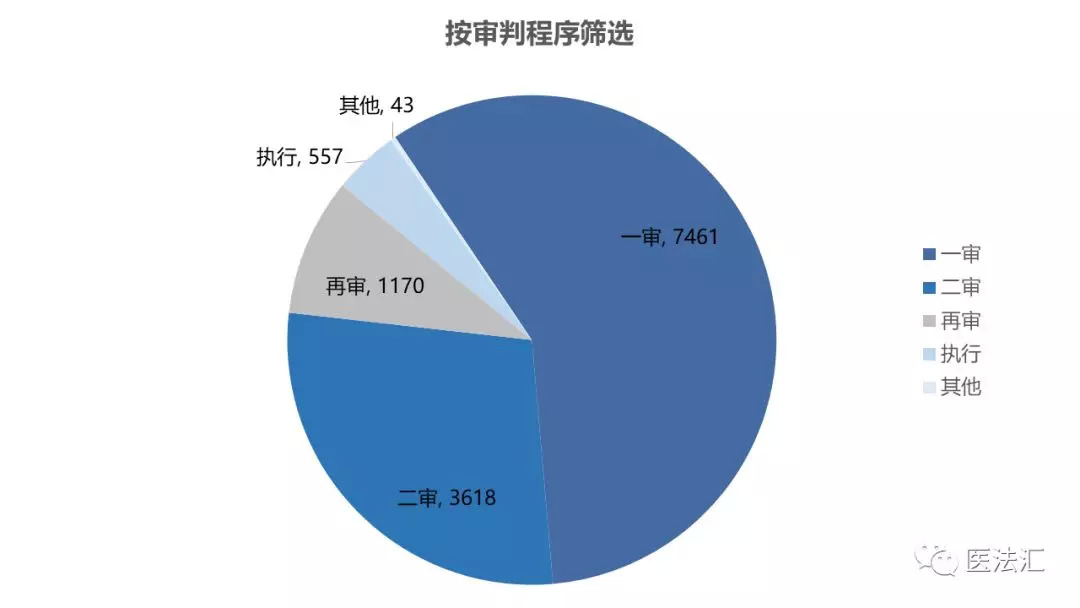 按人民法院审判程序划分,2018年一审审结的医疗损害责任纠纷案件共计7461件,进入二审程序的有3618件,经过再审程序的案件有1170件。除此之外,执行程序的案件有557件,其他程序的案件有43件。
