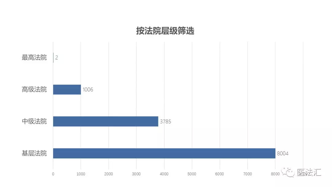 法院层级与审判程序有一定的关联,因此医疗损害责任纠纷案件在法院层级上的分布情况与审判程序相差不大,2018年基层人民法院审理医疗损害责任纠纷案件8004件,中级人民法院审理医疗损害责任纠纷案件3785件,高级人民法院审理1006件,最高人民法院审理2件。