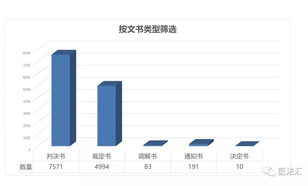 在检索的法律文书中,判决书结案的共有7571件,裁定书结案的共有4994件,这两种文书类型占据了绝大部分的比例。值得注意的是,调解结案的数量为83件,较2017年的9件有了大幅上升,由此也可以看出以调解为主解决医疗纠纷的趋势导向。
