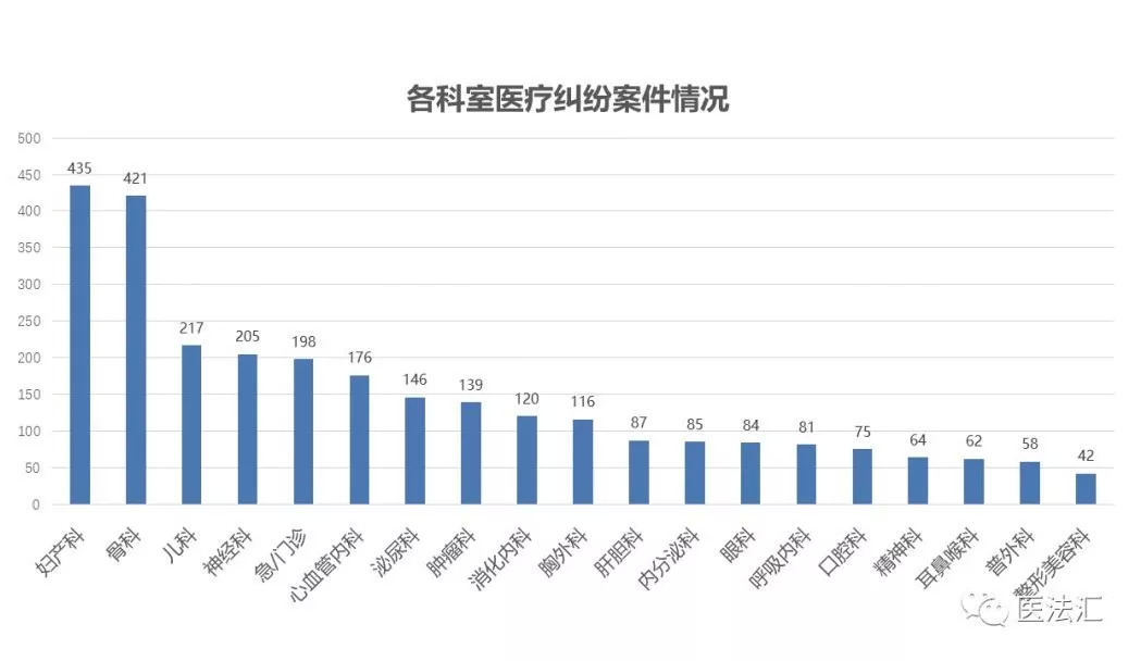 根据案例数据库显示,妇产科、骨科成医疗纠纷案件高发科室,二审判决涉及到妇产科、骨科的医疗纠纷案件数量均超过400件。儿科的医疗纠纷案件数量排在第三位,在一定程度上受到妇产科医疗纠纷高发性的影响。
