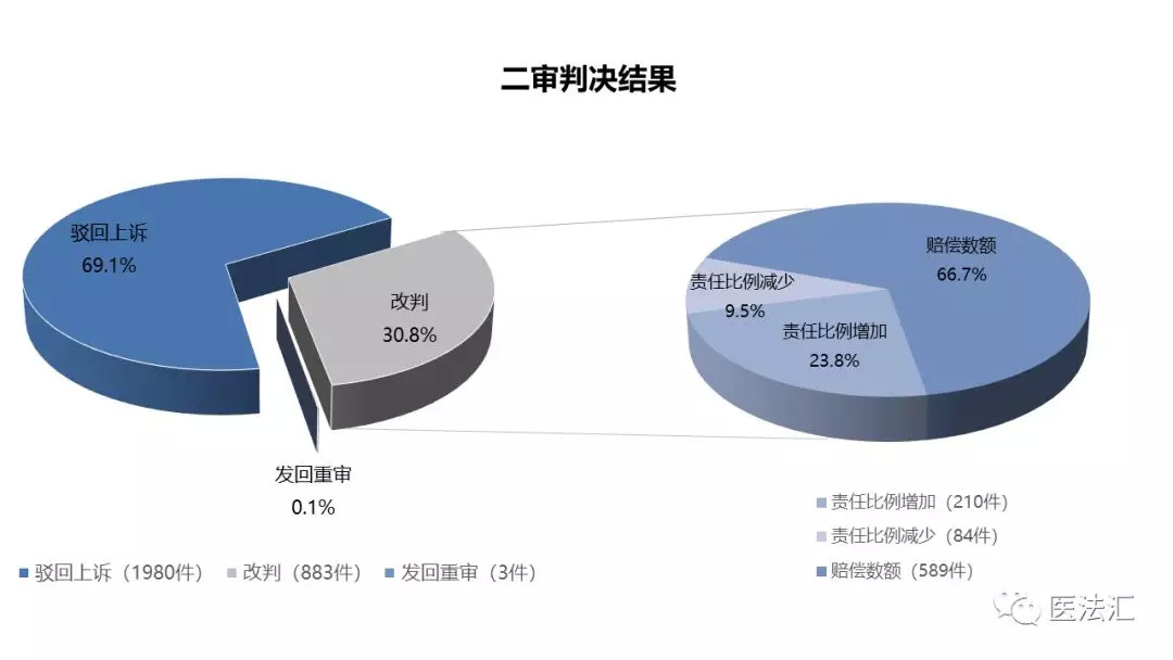 二审判决驳回率高,责任比例改判有难度。二审判决“驳回上诉、维持原判”的案件1980件,驳回率为69%,由此可见二审改判难度之大,也间接反映出一审程序的重要性。二审改判的案件883件,改判率为30%,其中仅涉及赔偿数额变动589件,从医方的责任比例大小来看,二审判决增加医方责任比例的案件210件,判决减少医方责任比例84件。