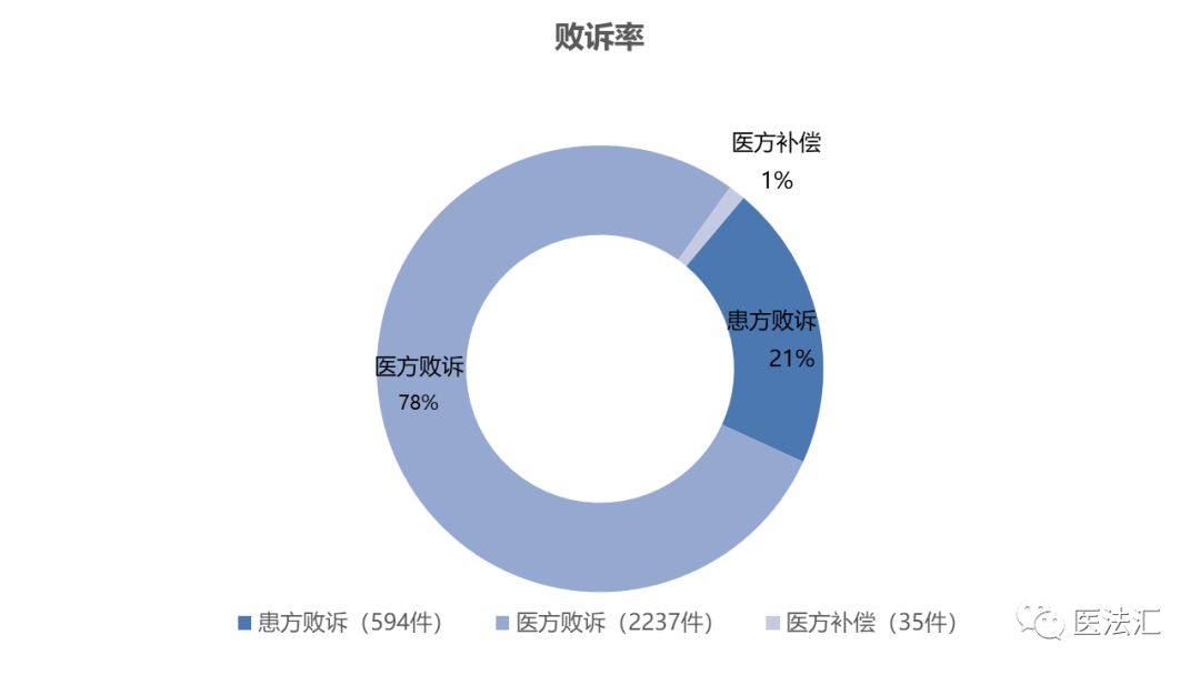 此处将患方败诉的情形限定为一审法院驳回患方诉讼请求,患方上诉后二审法院判决驳回上诉、维持原判。统计的2866件二审判决中,医方败诉2237件,占比78%,患方败诉594件,占比21%。与2017年的医方败诉率77%、患方败诉率23%相比,医患双方败诉率基本持平。另外,2018年还有35件判决医方给予患方适当补偿。
