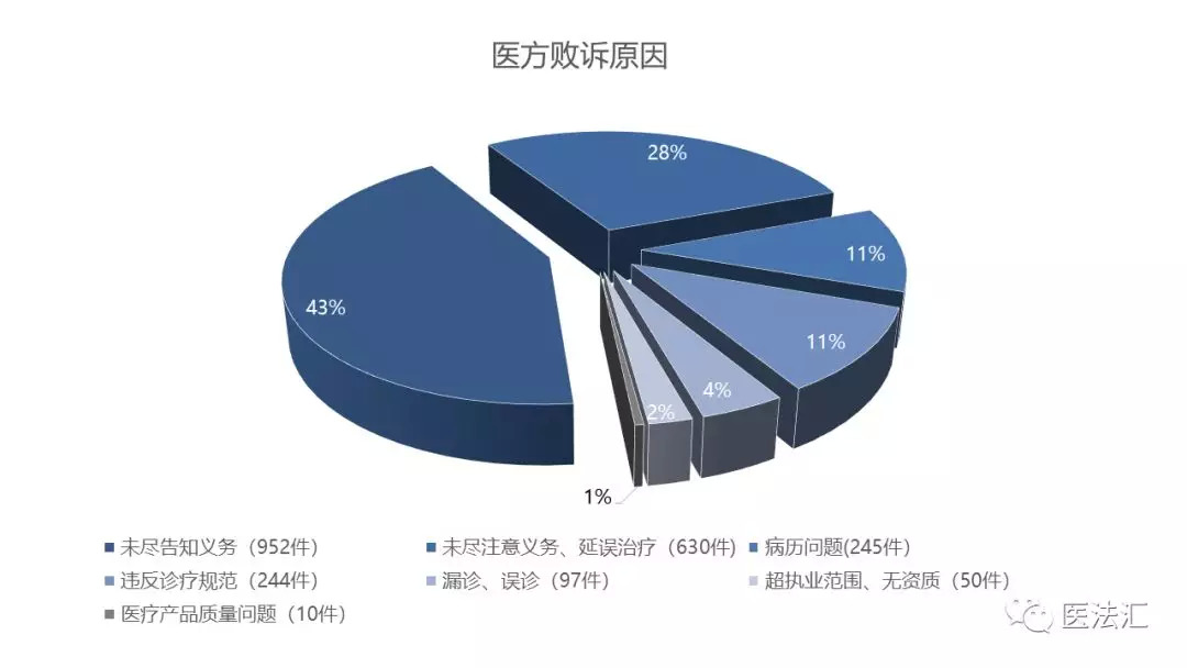 2017年医方败诉原因占比最高的是未尽注意义务、延误治疗,为33%,其次才是未尽告知义务,占比23%。而在2018年,医方因未尽告知义务而败诉的案件数量高达952件,占比42%,与2017年相比增长了近20%,成为致医方败诉的第一大因素。究其原因,一方面与患者的法律意识提升有关,患者对自身知情同意权的维护意识越来越强;另一方面,医疗机构对患者及其家属履行告知义务的主要证据即为病历材料,而病历材料记录不完整、书写不规范会直接影响法院对医疗机构告知义务履行情况的判定。且目前医疗机构对患者及其家属的告知多为形式上的告知,不注重告知义务的全面履行,这也使医疗机构更容易被认定存在未尽告知义务的过错。