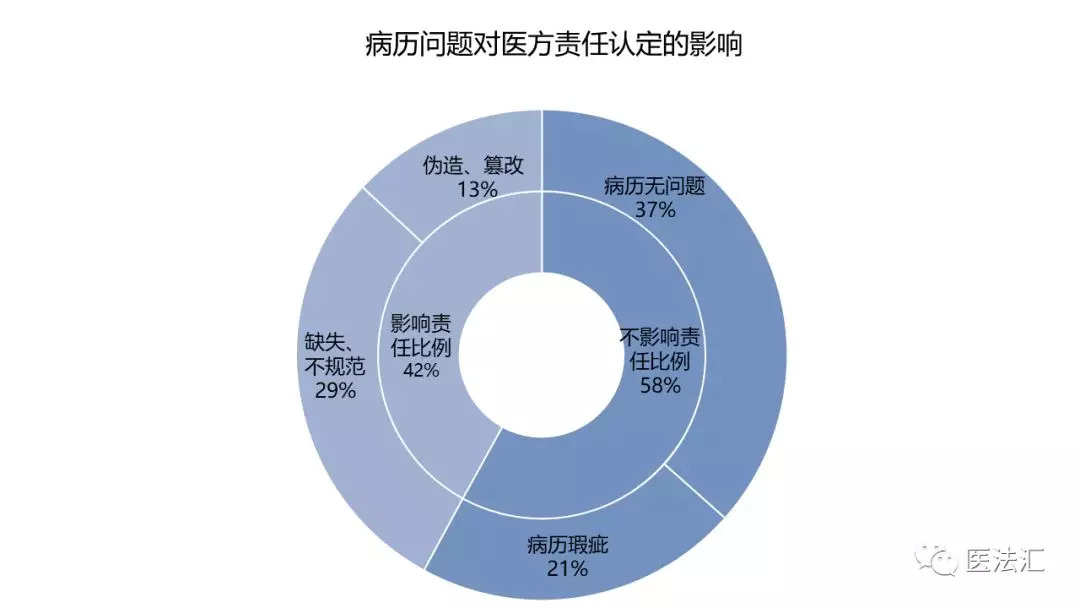 病历篡改、伪造认定率不高,但病历问题对院方责任的影响不容忽视。我们将病历问题对院方责任的影响分为两类:实质性的影响和非实质性的影响。实质性的影响是指病历材料的真伪、书写不规范等问题影响了法院对医疗机构医疗损害责任大小判定的情形;非实质性的影响是指病历材料存在的瑕疵问题不足以使法院认定医疗机构的过错,或者经医疗机构的合理解释,法院直接认定病历材料不存在问题的情形。