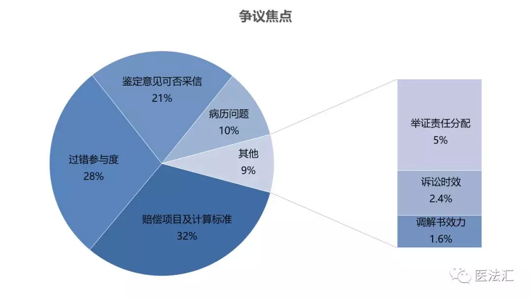 二审中涉及最多的争议焦点仍然是过错参与度的大小、赔偿项目及赔偿标准,其中尤以精神损害赔偿的标准问题争议最大。关于精神损害抚慰金的数额,法院一般都会依据《最高人民法院关于确定民事侵权精神损害赔偿责任若干问题的解释》第十条之规定,按照医疗机构的过错程度、患者遭受的损害后果等实际情况酌情确定,二审中的改判率不高。另外,法院对鉴定意见的采信情况以及病历问题对院方责任比例的影响,也是常见的争议焦点,分别占比21%和10%。