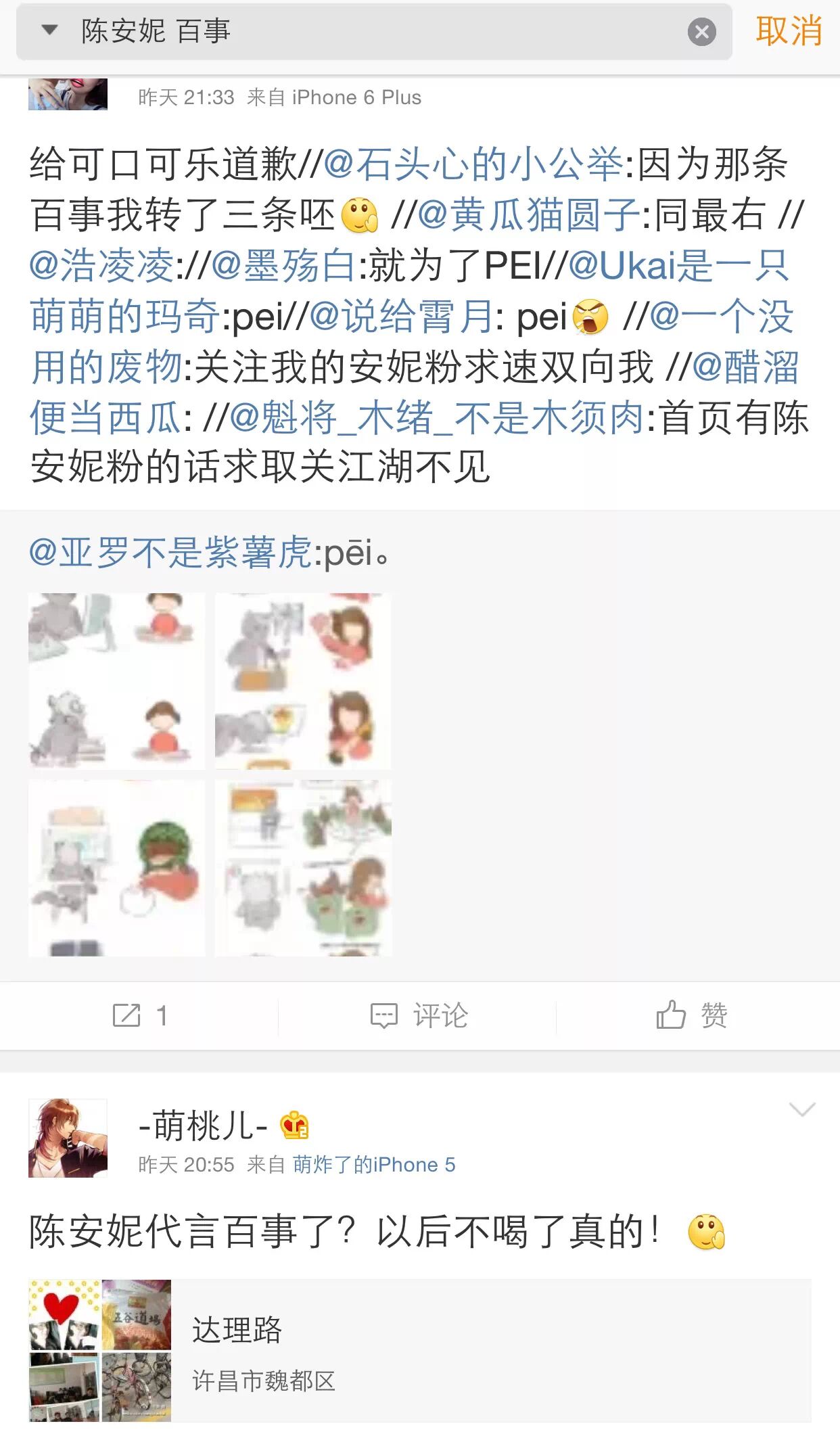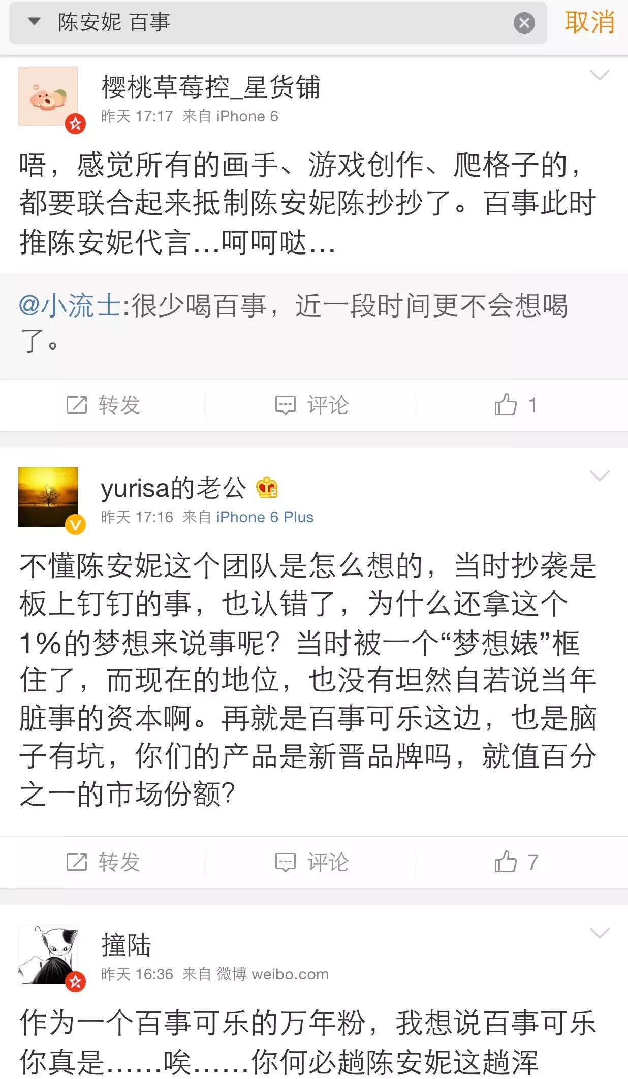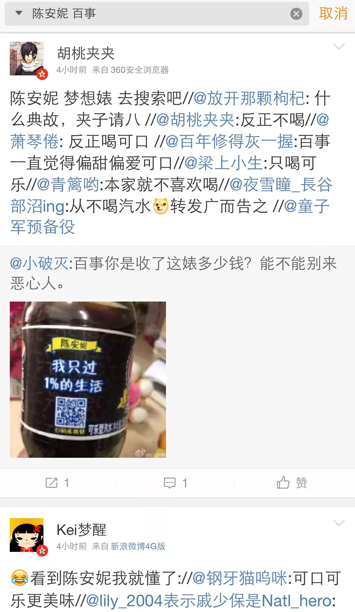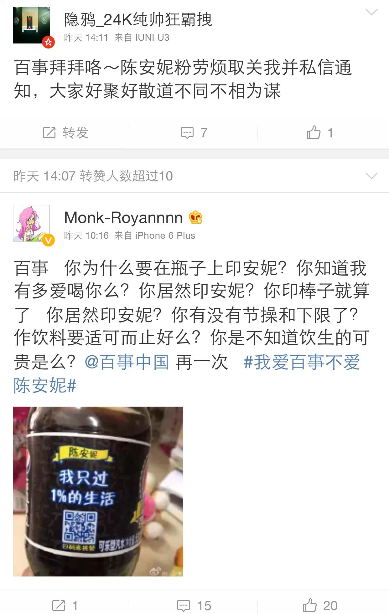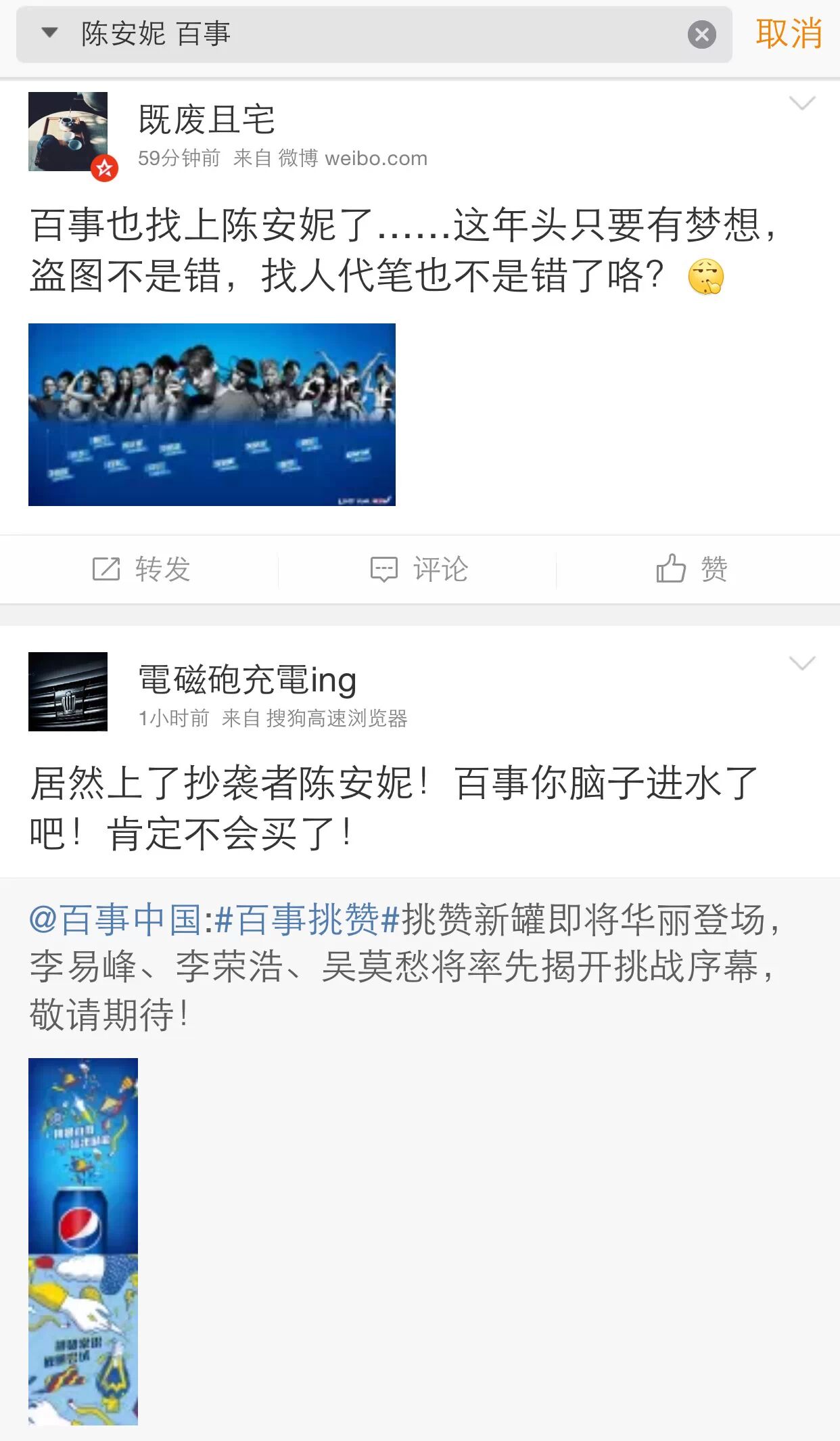其实风和君是被网友们激进的“challenge”给震撼到了,与其说是“百事挑赞”,还不如说是“挑烂”。真的哦,只要在微博里面输入“陈安妮 百事”两个关键词,99%的负面评论,最后的1%当是安慰吧。