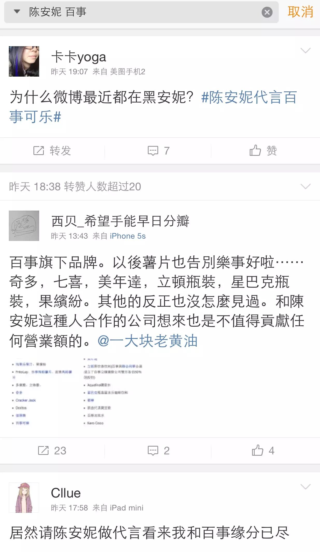 不过弱弱想想,网友们其实还是针对的陈安妮,顺带把怒气撒到百事,如果解除与陈安妮的合作,让她删除原图文,先平复线上的骚乱。线下嘛,就顺其自然吧。