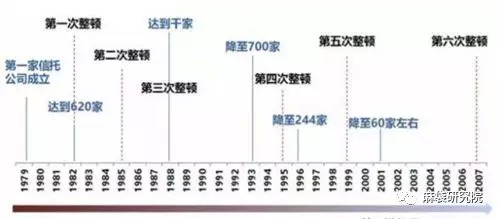 下图展示了从1979年信托恢复经营以来,历次整顿与信托机构数量变迁情况: