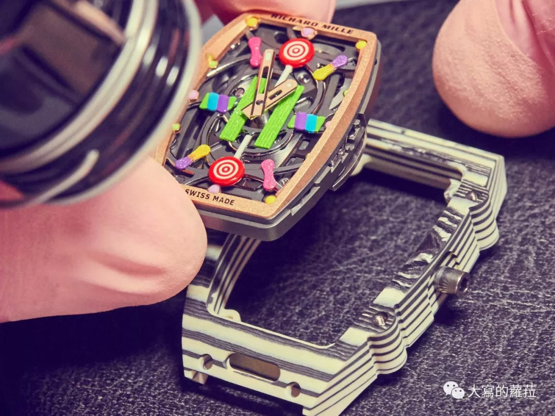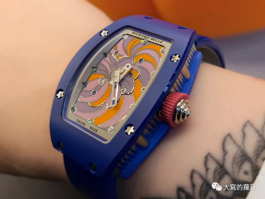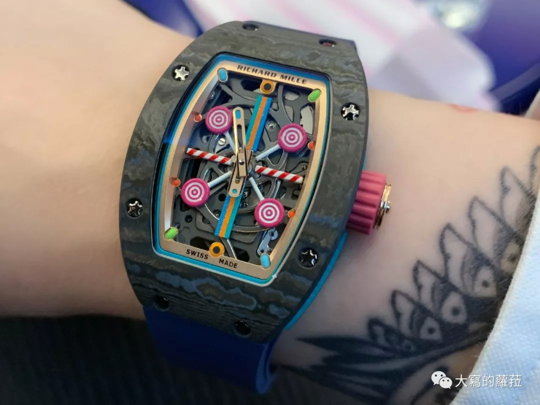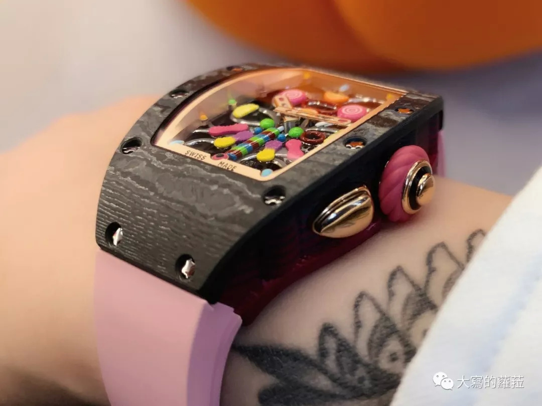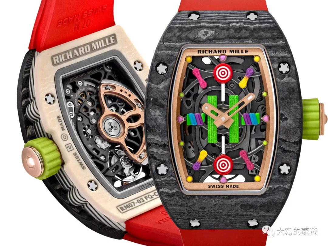 2019年RICHARD MILLE的BonBon系列也透露着RICHARD MILLE对于科技材质、甚至高科技陶瓷材质的掌控能力,粉红色、粉橙色的陶瓷、红色、绿色、蓝色的鲜艳TPT材质。RM不但掌握了高科技陶瓷、蓝宝石水晶以及TPT等材质创作各种符合主题设计的色彩能力,所有TPT科技材质原材料到了RICHARD MILLE自有的表壳厂都能进行加工制作,这也是在工艺上与制作设备上RM投入庞大资本下,仍然能在行业里不但在技术、概念、销售额、甚至价位领先的最大原因。