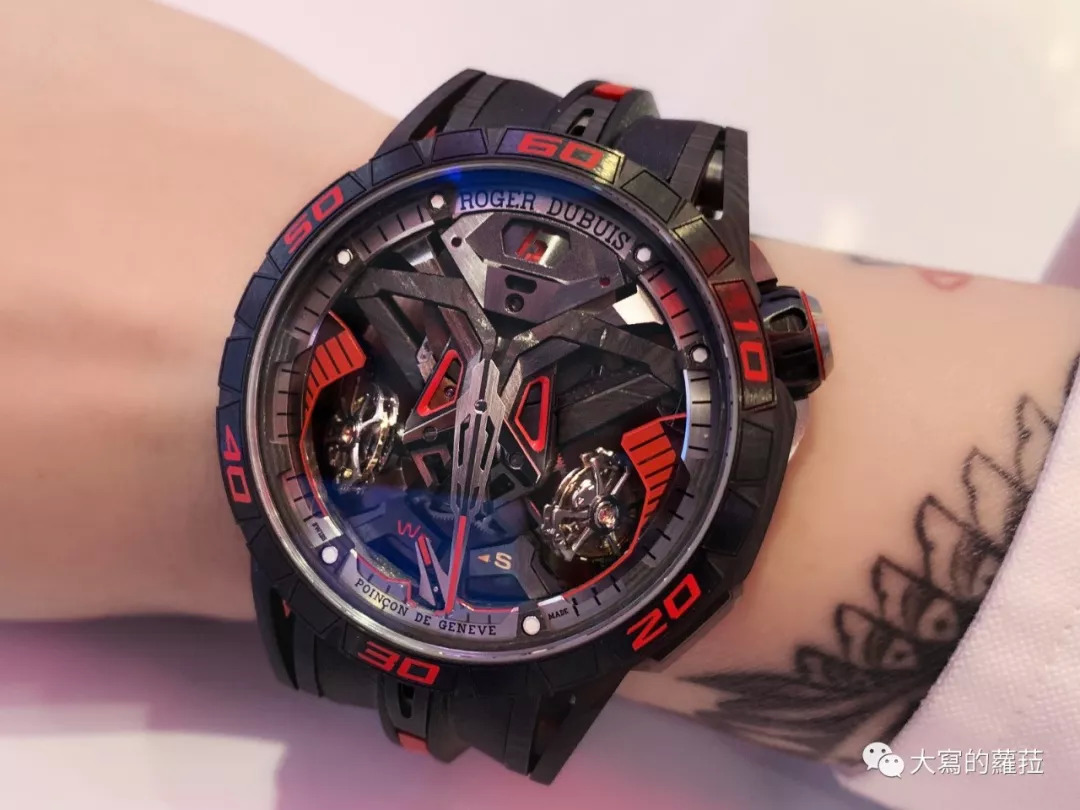 碳纤维材质因其轻量的特性,最常被使用在跑车、竞赛用车等的制作,Roger Dubuis今年发表的Excalibur One-Off就是借镜擅长碳纤维运用的超跑品牌兰博基尼全碳纤维超跑SC 18 Alston,表壳、机芯夹板等使用了SMC复层碳纤维材质,表壳中层则使用了编织碳纤维制作,搭配的黑色陶瓷表圈,刻度、时标等则以红色的液体陶瓷灌入,47毫米的豪气尺寸就像一架公牛般的跑车,非一般人能驾驭。