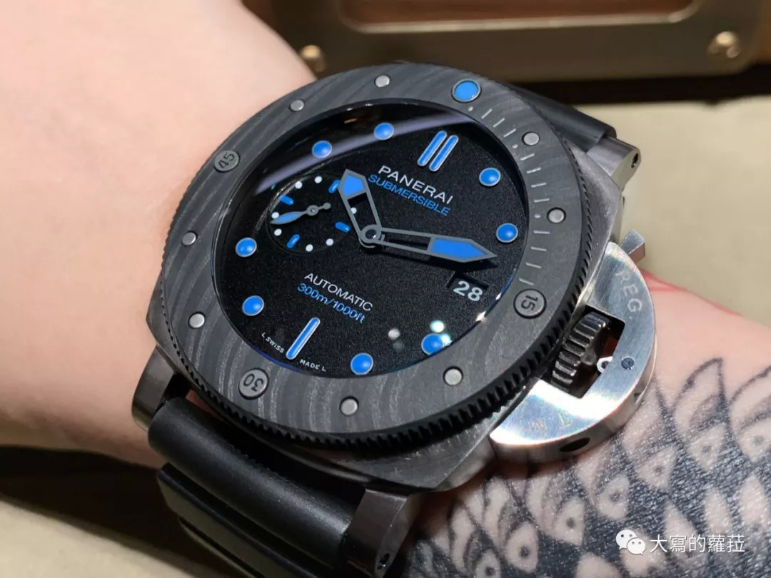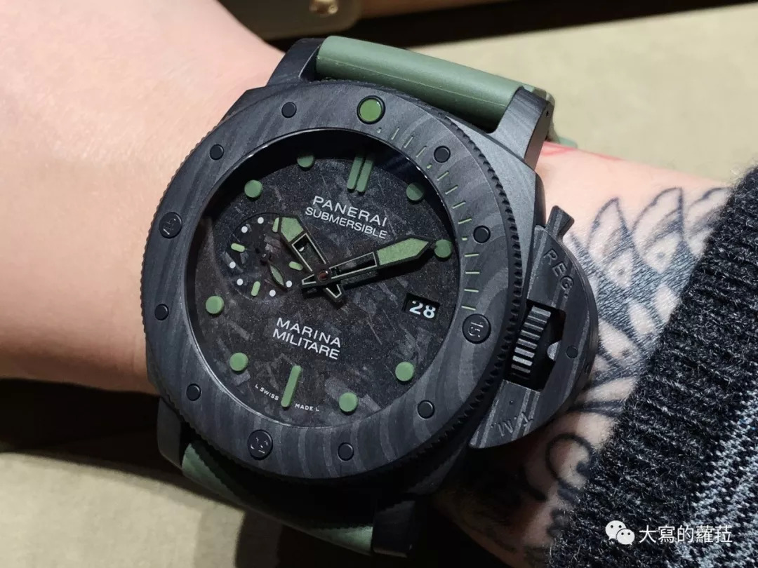 碳纤维的变化材质还有沛纳海的Carbotech 材质,沛纳海将PEEK材质与碳纤维交错层叠制成,这种复合材质会有产生一种我们昵称为〝油花感〞的纹理,碳纤维的坚硬与轻质都是Carbotech 材质的特点,从2015年的PAM616开始,沛纳海就已经尝试使用这种材质的表壳设计,2019年运用在潜行系列的PAM979潜水腕表,Carbotech 雾黑的色泽搭配单一灰白色的时标与刻度;以及PAM961搭配绿色时标、刻度的限量款式,都意外地将潜水腕表的刚硬设计扭转为亮眼的〝潮〞感。